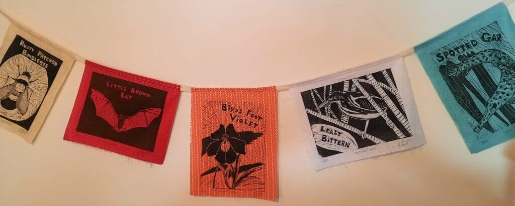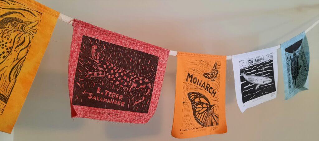 Endangered Species Flags (2 sets of flags each comprised of 5 hand-printed linocuts on fabric and sewn on a cord in a group, much like Prayer Flags). All of the plants and animals depicted on these flags are considered endangered, threatened, extirpated, or of special concern. All, but one, the Fin Whale, are at risk in Ontario. Currently there are over 200 species at risk in Ontario. (A few sets are available for purchase. If you are interested, please contact me for more information.)