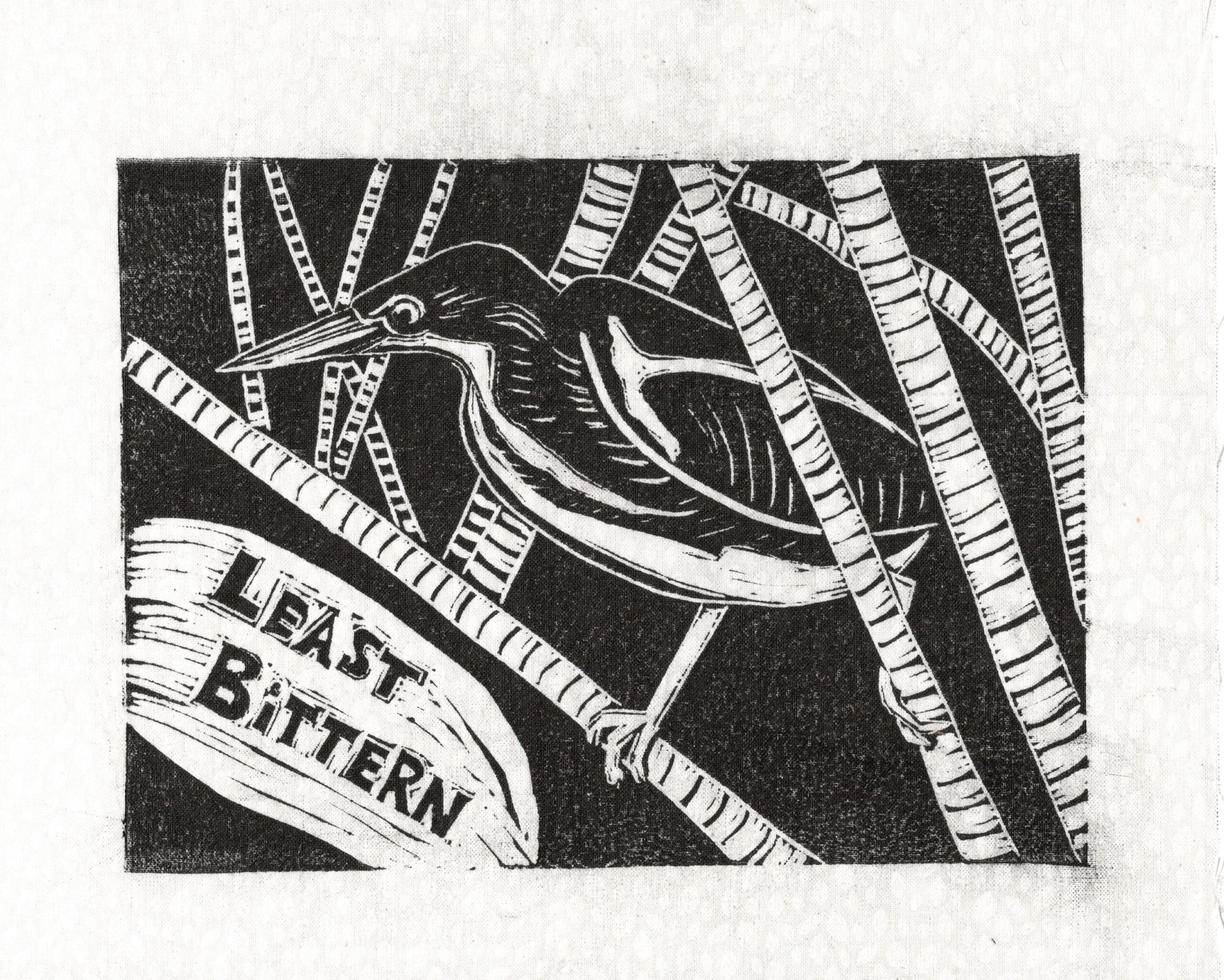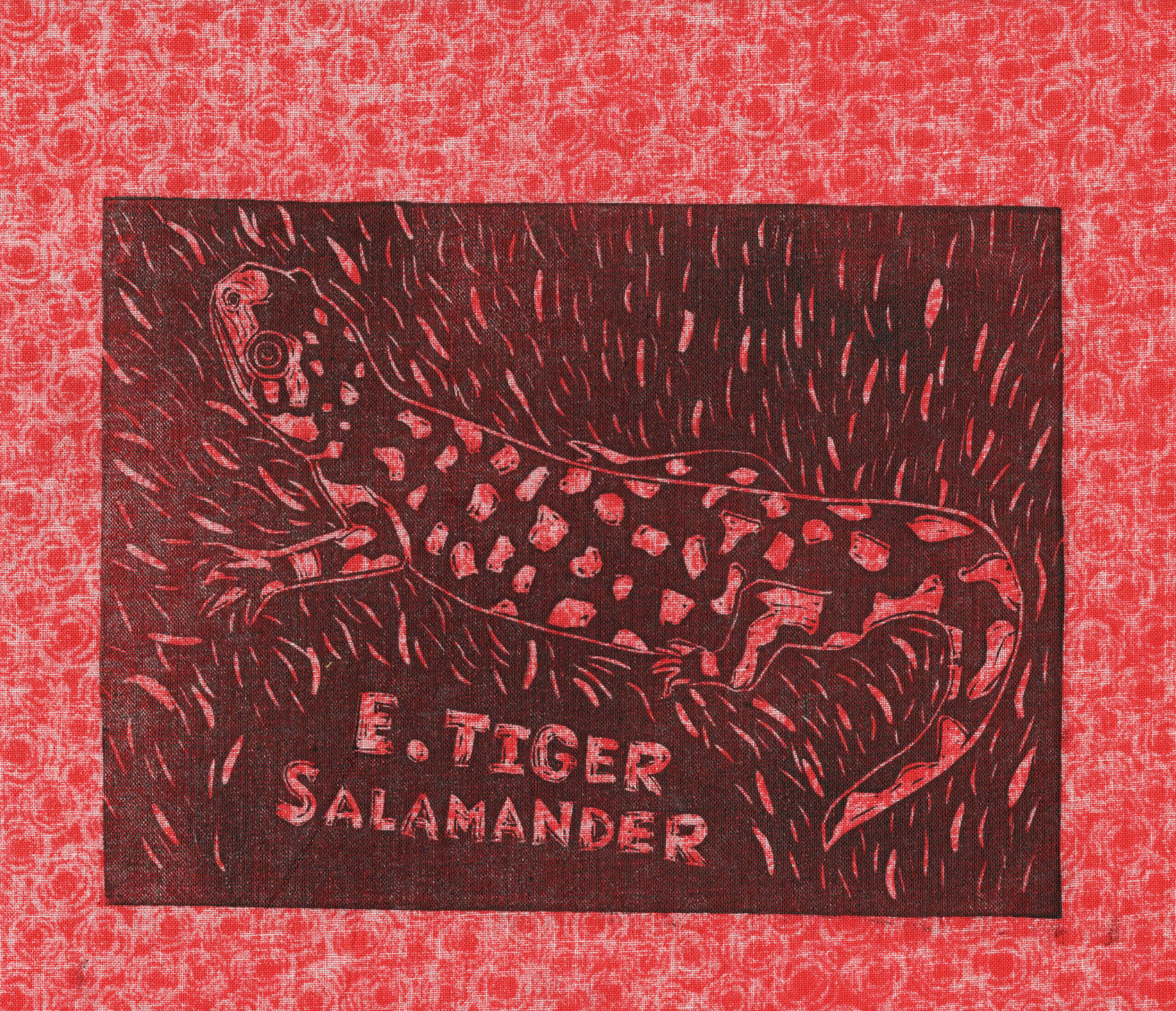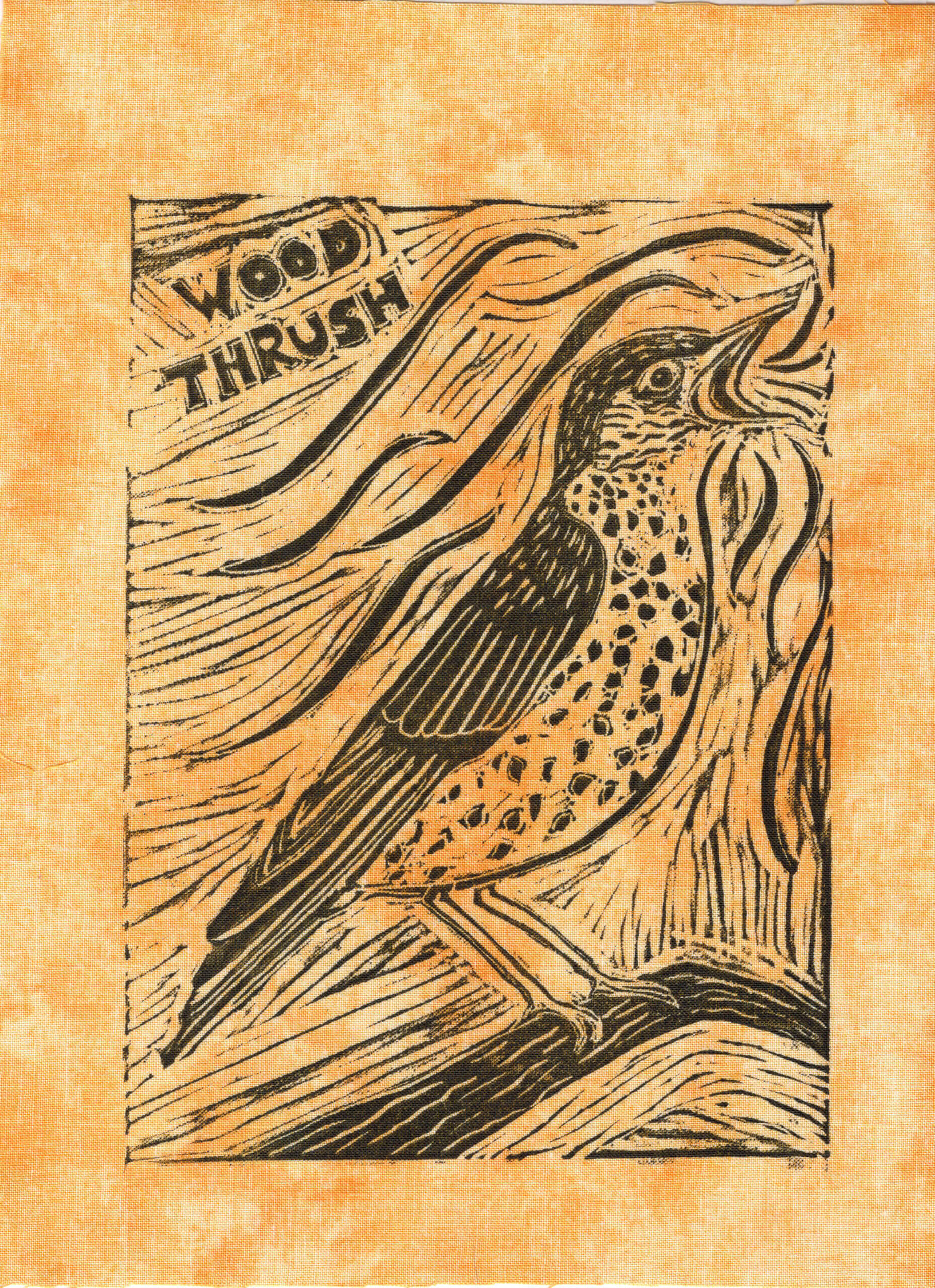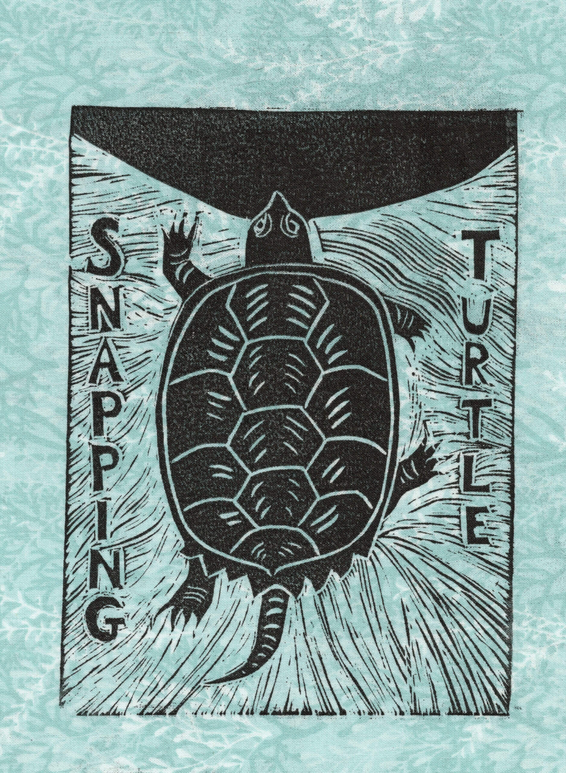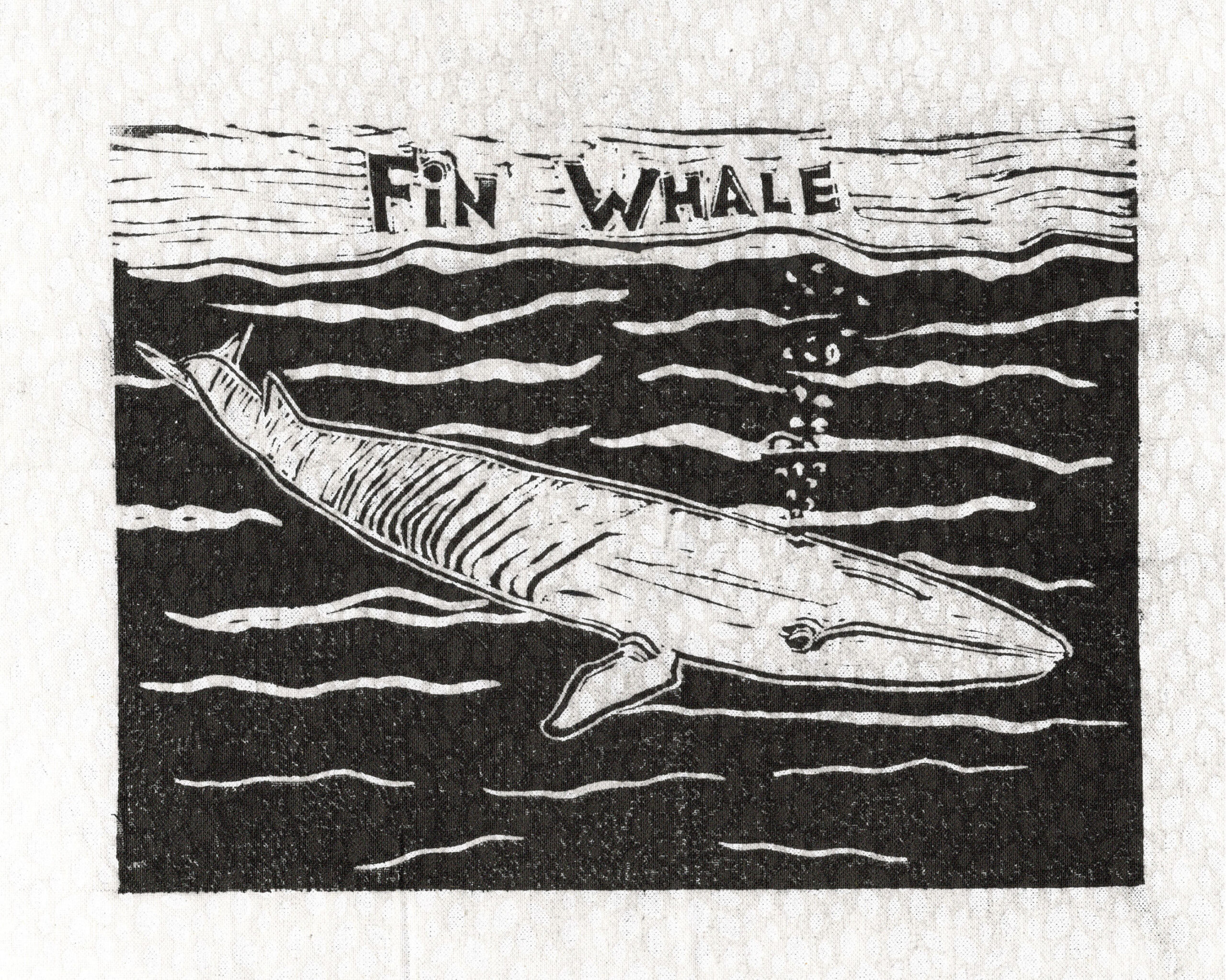 Endangered Species Flags (2 sets of flags each comprised of 5 hand-printed linocuts on fabric and sewn on a cord in a group, much like Prayer Flags). All of the plants and animals depicted on these flags are considered endangered, threatened, extirpated, or of special concern. All, but one, the Fin Whale, are at risk in Ontario. Currently there are over 200 species at risk in Ontario. (A few sets are available for purchase. If you are interested, please contact me for more information.)
